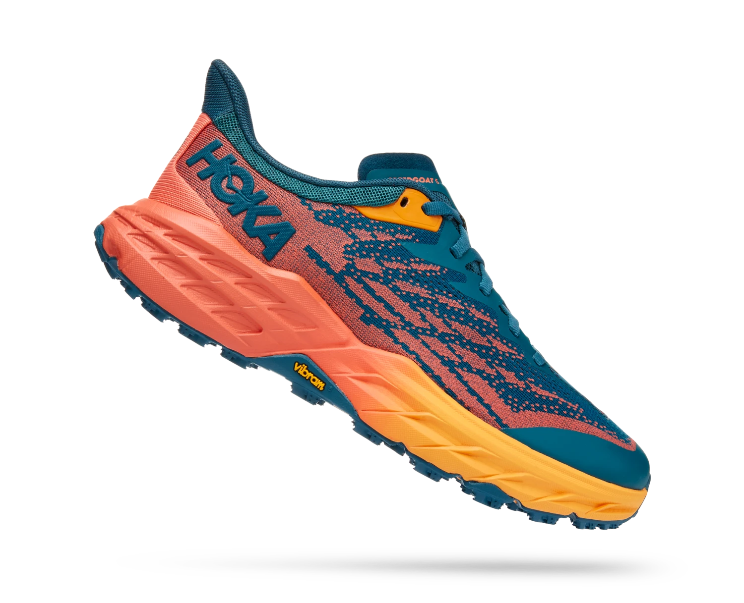 A workhorse designed for technical trails, the Speedgoat returns with less weight and more traction than ever before. A new shoe from outsole to laces, this trail beast is updated with Vibram Megagrip with Traction Lug for enhanced grip on loose soil. Retaining the same stack height and rocker profile, the Speedgoat 5 employs a lighter midsole compound and heartier, double layer jaquard mesh to inspire confidence on any terrain.